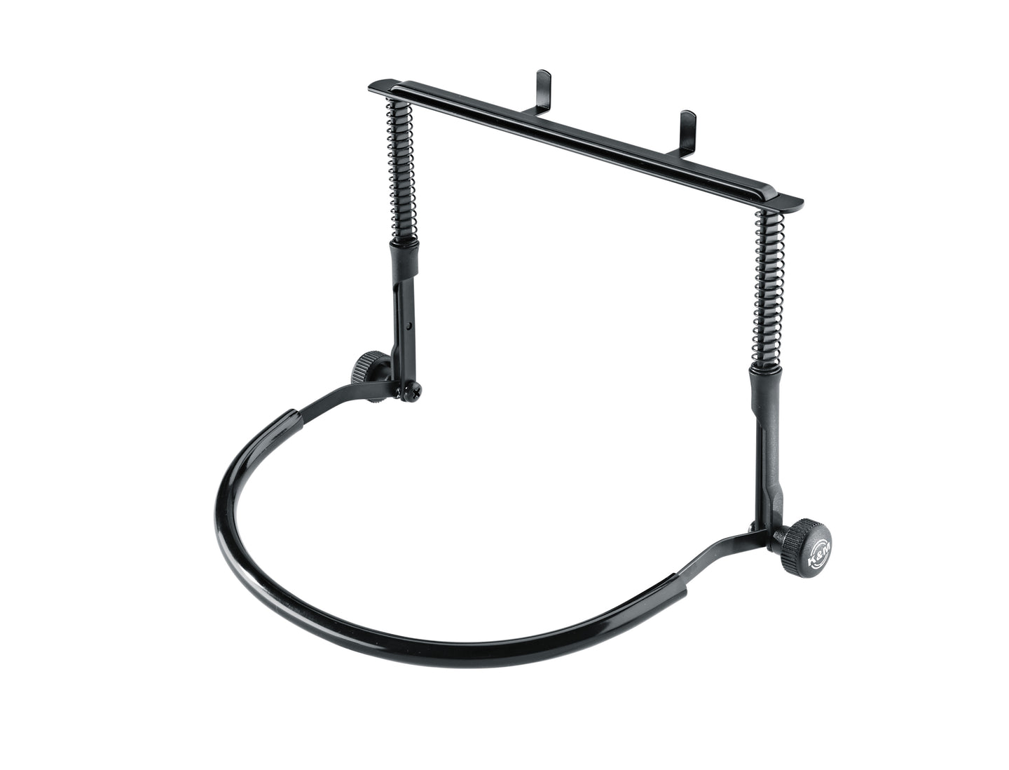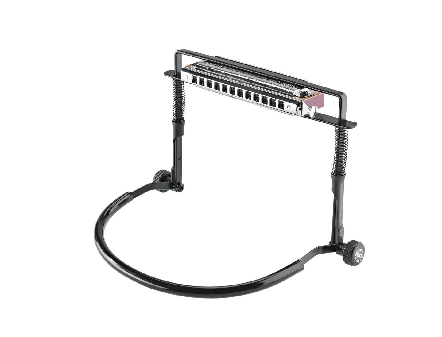 Elegant harmonica stand with professional features. Fully adjustable spring-loaded instrument holder. Neck frame is covered with exclusive soft rubber material for comfort. For various harmonica models.