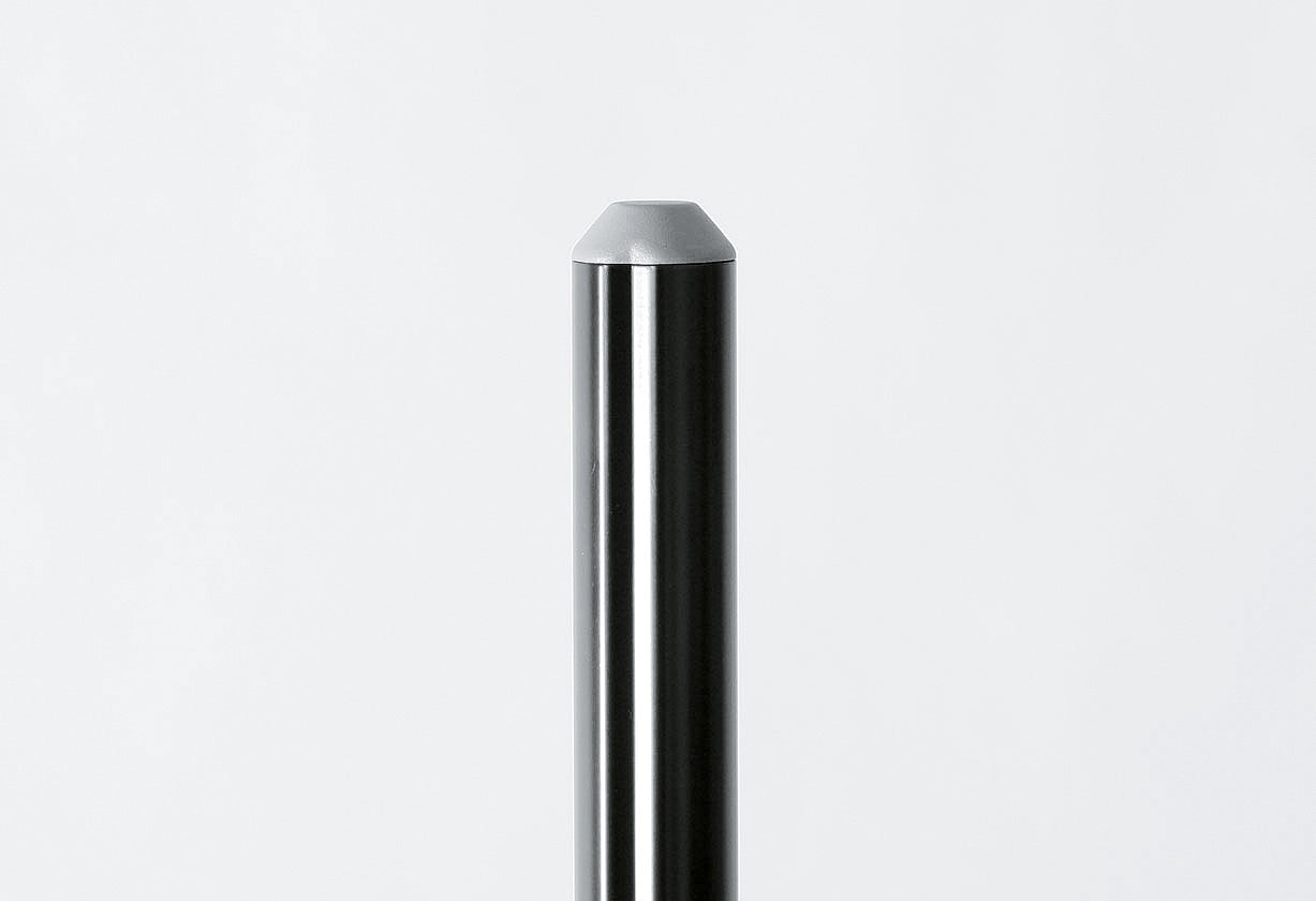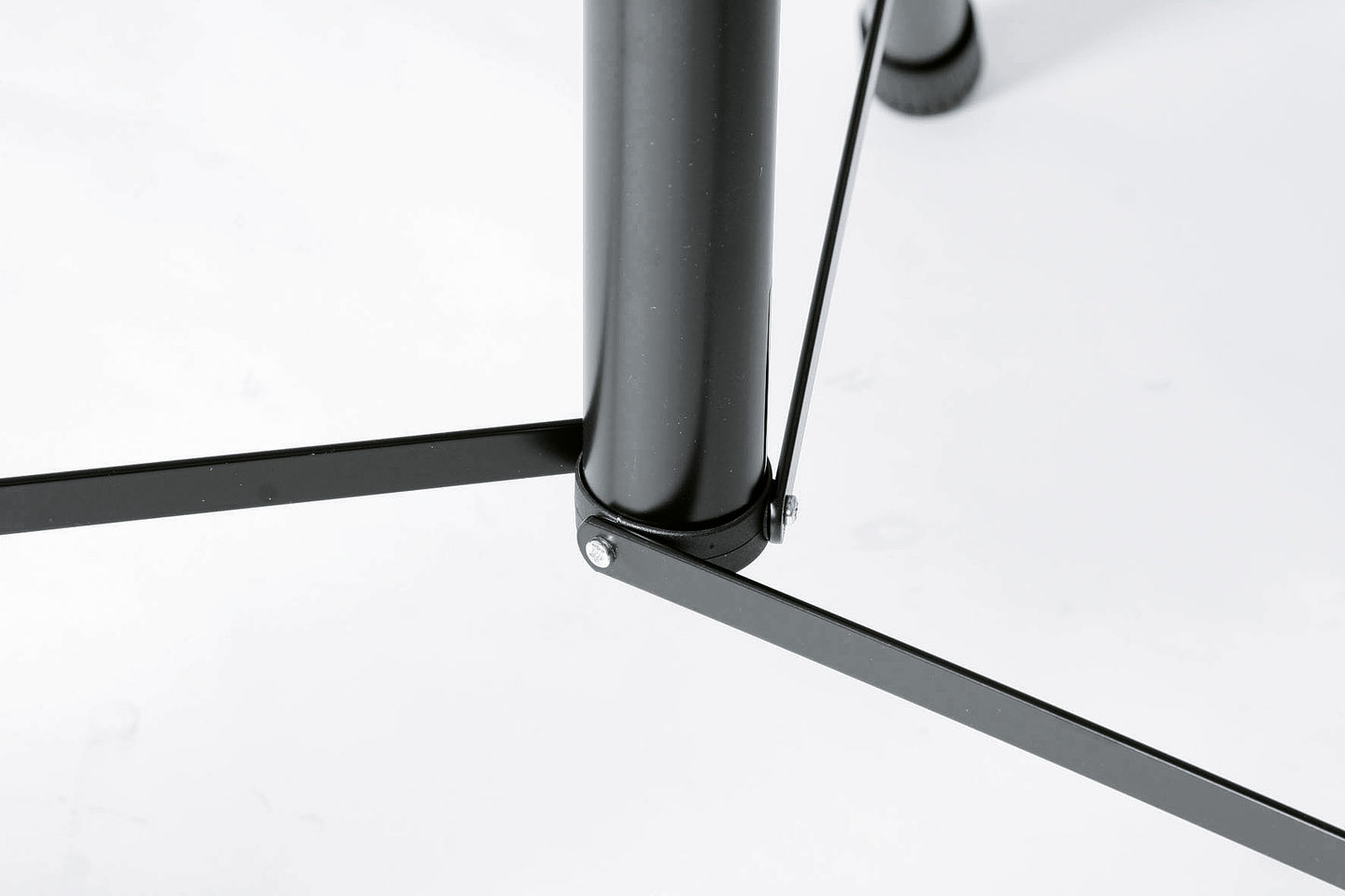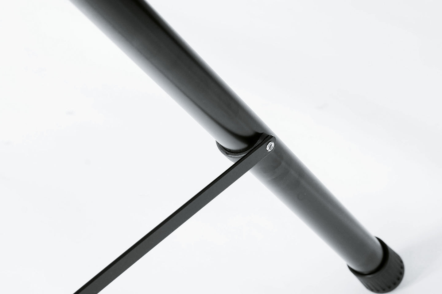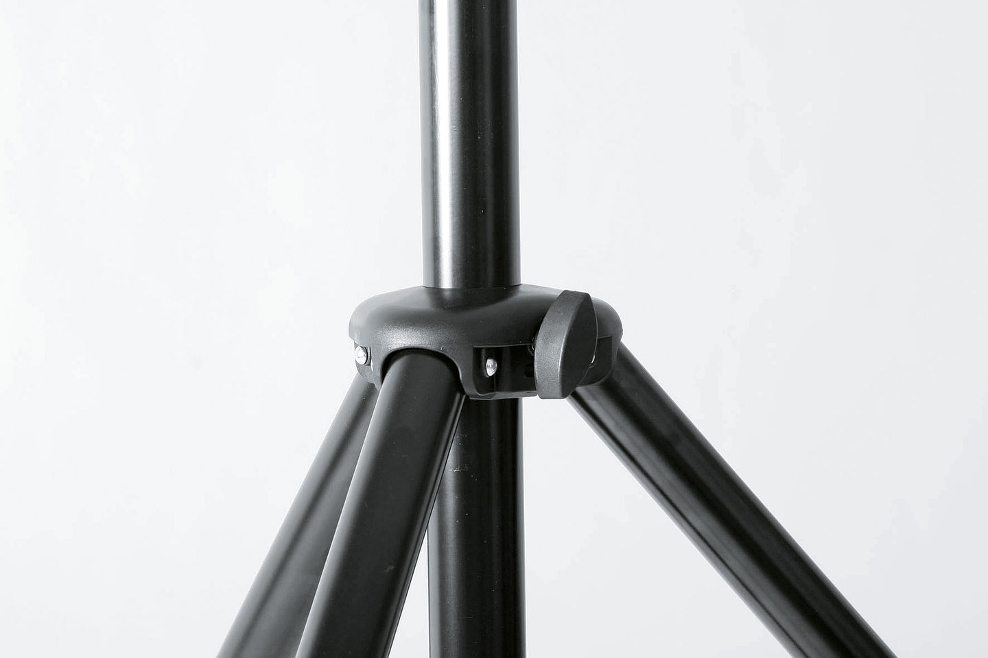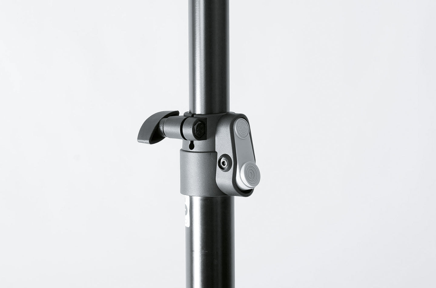 The standard speaker stand constructed from steel tubing has been significantly improved. The new feet with a tube diameter of 35 mm and the large fixed foot caps guarantee stability and safety. Laser-bored holes and durable, sturdy plastic saddle washers improve the coefficient of friction between legs and straps and prevent scratching of the finish. A compact clamp with a patented push-button system allows user-friendly adjustment of the stand height. The locking screw provides additional stability and vibration-free speaker support. Additional features include anti-tear protection for the extension tube, mounting aid and an integrated shock component.