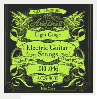 Aria Pro II electric guitar strings are made from nickel plated steel wire wrapped around a hexagonal core.