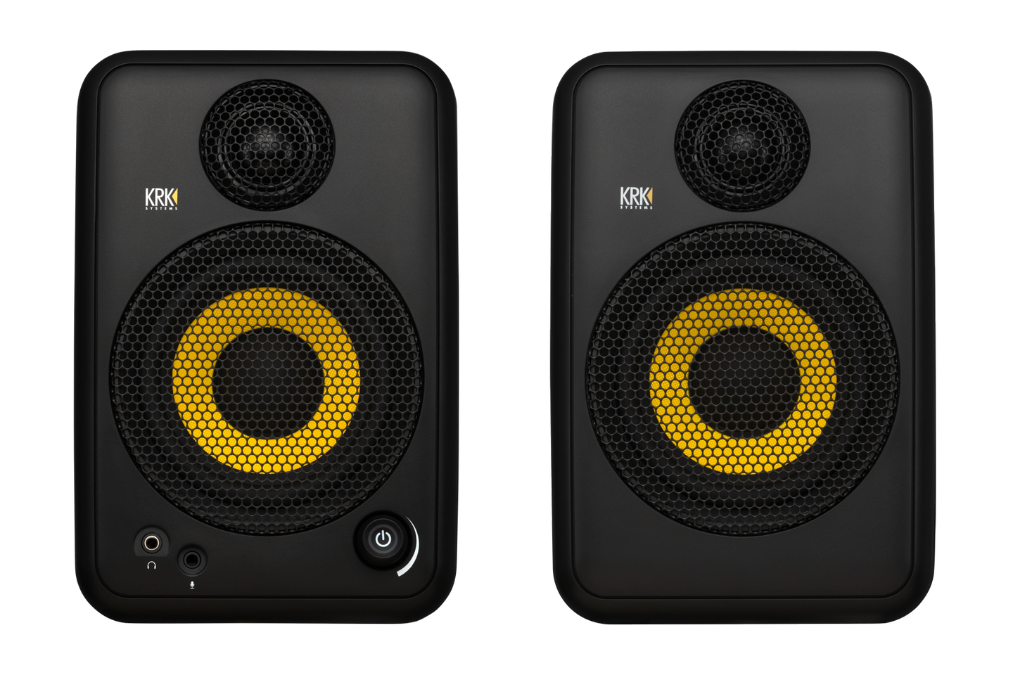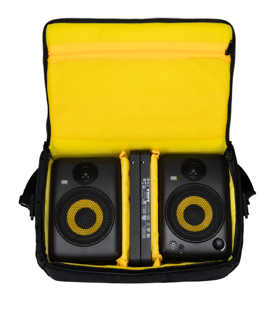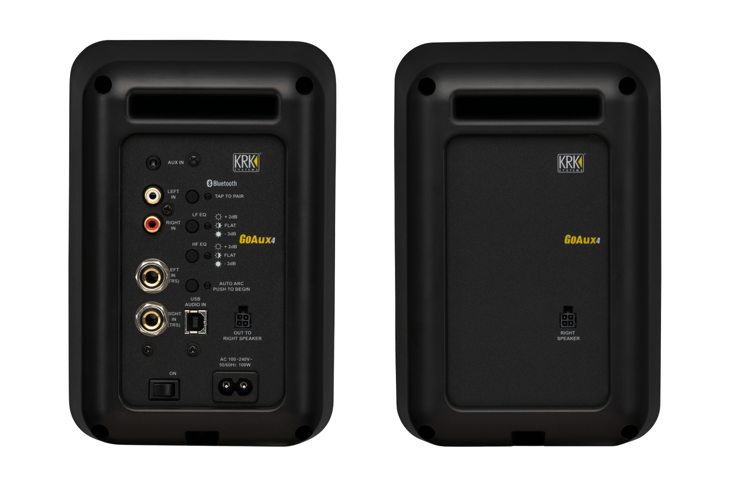 The KRK GoAux 4 portable nearfield monitors are designed to deliver quality sound wherever you go. Perfect for musicians and engineers on the go, they deliver renowned KRK sound quality in a mobile-friendly form factor. Because they’re designed to go with you, the GoAux 4 monitors come with a convenient nylon carrying case that holds both monitors plus the included monitor stands, Auto ARC microphone, and any extra cables you might want to take with you. The stands are adjustable for optimal monitoring positioning and angles. The GoAux 4 monitors combine a 4” glass aramid woofer with a 1” soft textile dome tweeter in a 100W RMS (total system power) bi-amplified, two-way design. The rear-ported ABS enclosures are durable and provide surprising bass extension for a portable speaker. With the power amplifiers located in one speaker's enclosure and the second speaker powered via an included speaker-level connection from the first, the pair only needs a single AC outlet to operate. Built-in LF and HF EQ lets you adjust the monitors' response to the room and your personal preferences. With the included measurement microphone, the built-in Auto ARC automatic room correction feature can automatically optimize the speakers' response to your acoustic environment. With balanced stereo USB, 1/8" Aux, RCA, and 1/4" TRS inputs, Bluetooth functionality means you can connect wirelessly to your smartphone, computer, or other Bluetooth-enabled audio device. When you need to listen in silence, you can connect to the front-panel 1/8" stereo headphone output, which automatically mutes the GoAux 4 speakers.