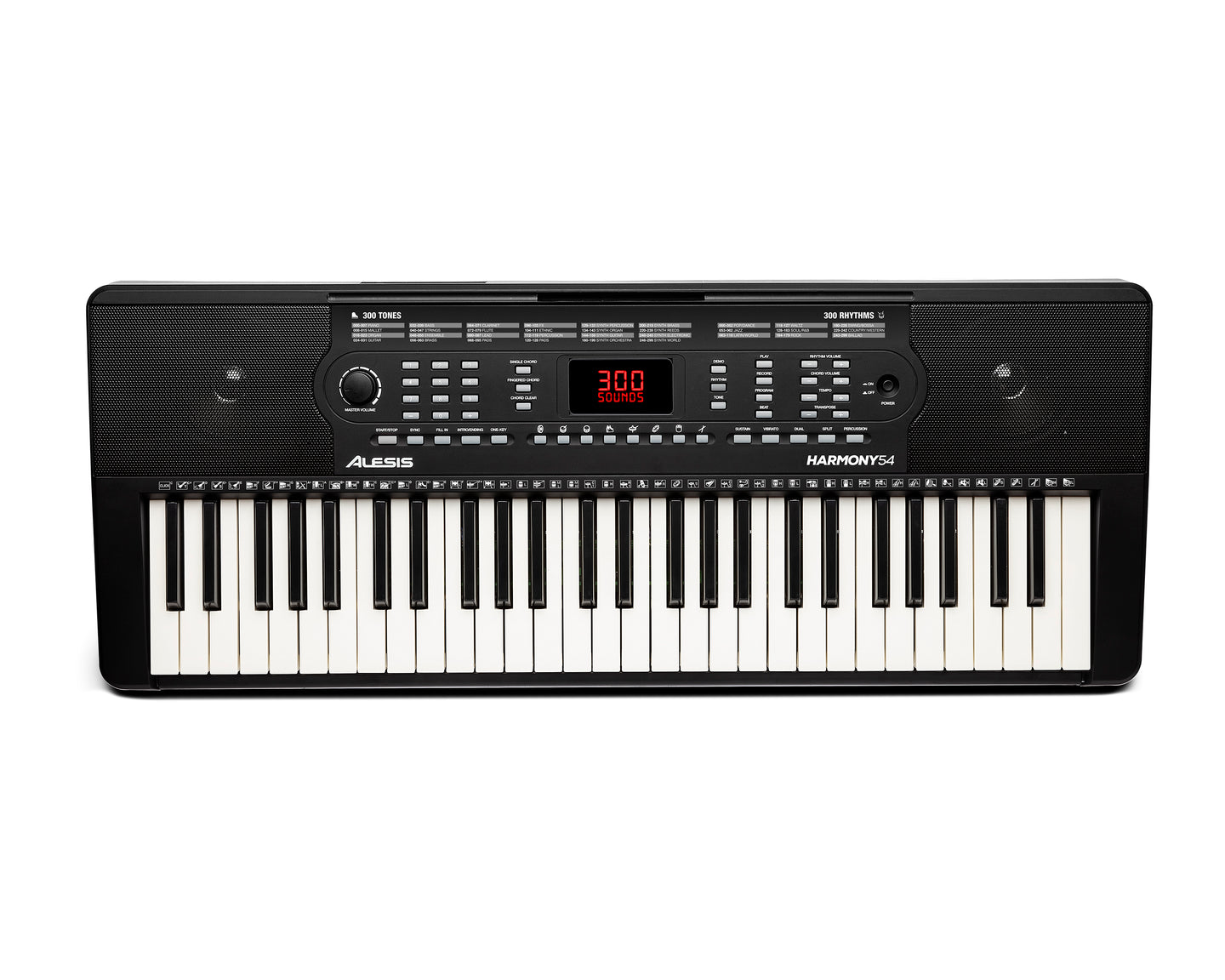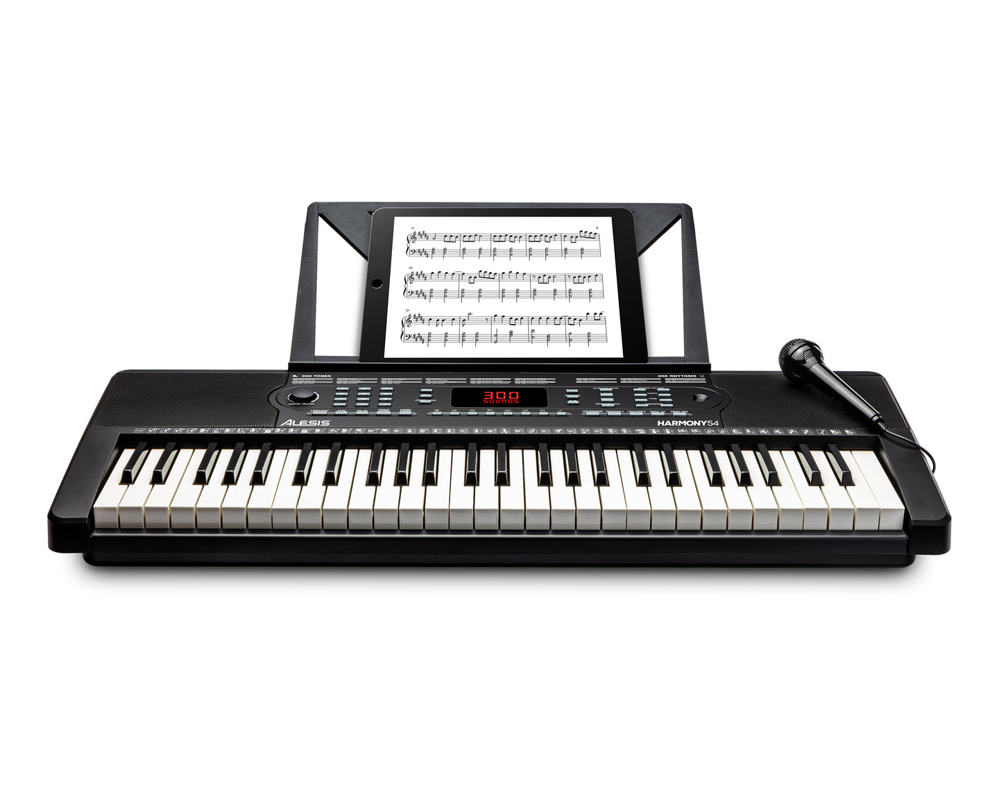 The Alesis Harmony 54 keyboard combines 54 piano-style keys, built-in speakers, 300 built-in sounds with layer and share modes, 300 built-in rhythms to play along to, 40 demo songs, a headphone input that automatically mutes the speakers for private practice, a music stand to hold sheet music or a tablet, an AC adapter, and even a microphone for singing while you play.
