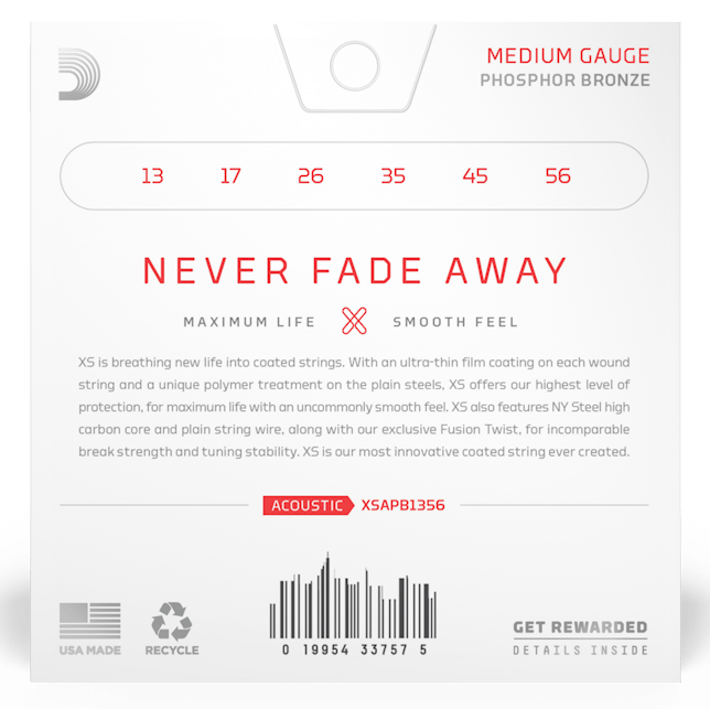 D'Addario XS Acoustic Phosphor Bronze strings combine our most popular acoustic alloy with our most advanced string coating technology, resulting in clear tone, smooth feel and superior tuning stability - all with the longest possible string life. With its ultra-thin film coating on each wound string and a unique polymer treatment on the raw steels, XS offers our highest level of protection for maximum string life. XS also features a high-carbon NY Steel core and single-strand string, plus our exclusive Fusion Twist, for unmatched break strength and tuning stability. XS is the most innovative coated string we've ever created. Never fade away!