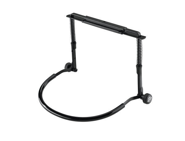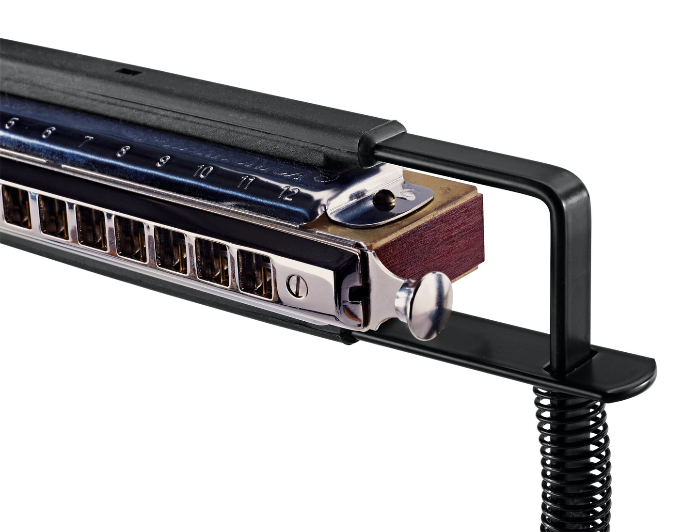 Particulièrement adapté aux modèles d'harmonica blues. Des sections en caoutchouc moulé sur les bras de support maintiennent l'instrument en toute sécurité. Le réglage est facile grâce à la tension du ressort et à deux vis moletées. Le cadre du manche est recouvert de caoutchouc souple pour un confort accru.