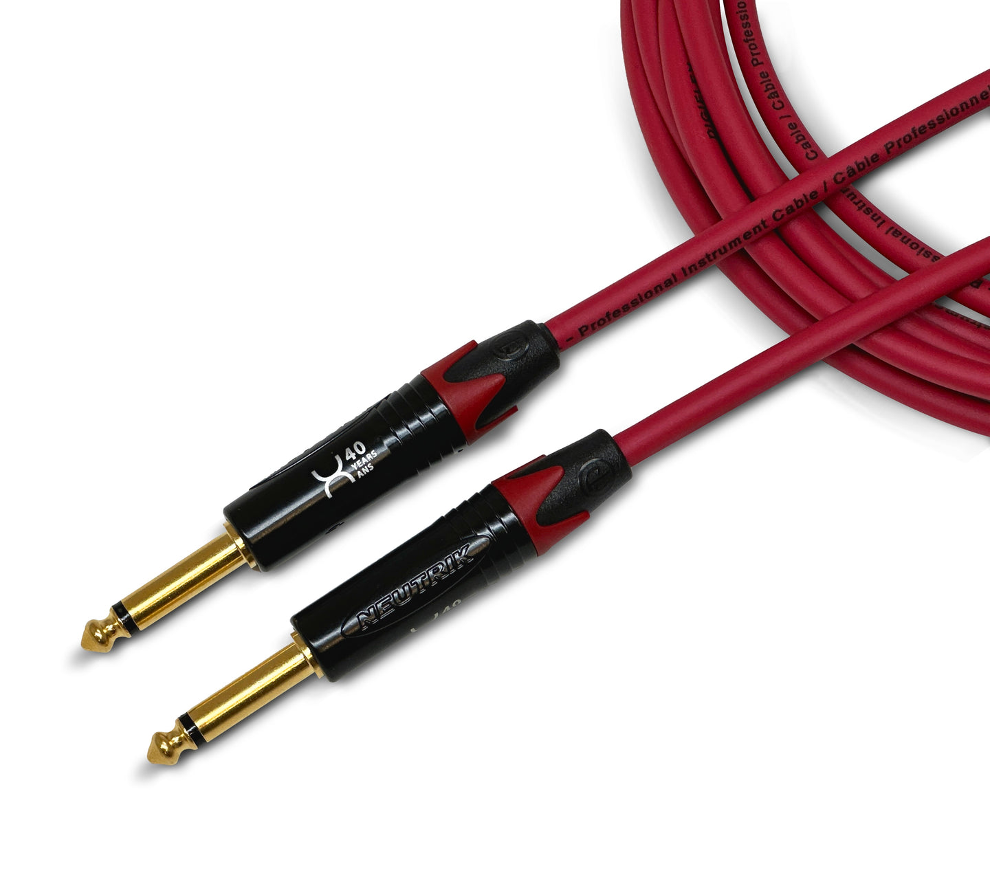 Connecteurs NEUTRIK 1/4 po avec gravure au laser spéciale 40e anniversaire avec des coquilles noires, des bagues rouges et des contacts en or.