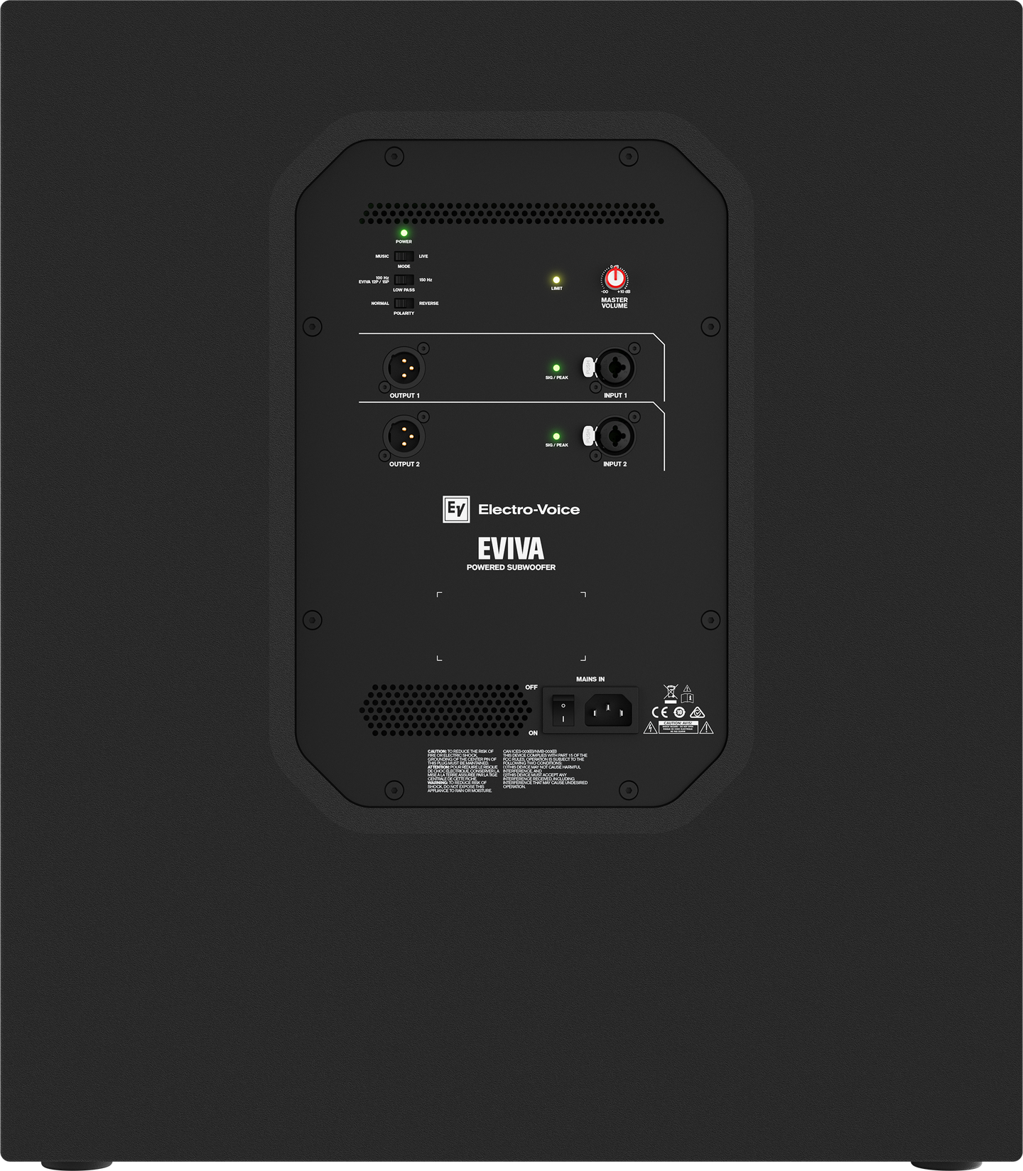 Ce caisson de basses robuste de 45,7 cm (18 pouces) en contreplaqué est équipé d'un amplificateur de 1 000 W avec une section d'entrée analogique à 2 canaux. Son panneau de commande intuitif comprend un bouton de réglage du niveau et des commutateurs permettant de sélectionner le mode MUSIC ou LIVE, le filtre passe-bas entre 100 Hz (EVIVA 12P/15P) et 150 Hz, ainsi que la polarité (NORMAL ou REVERSE). Le caisson est alimenté par une prise secteur IEC universelle à commutation automatique (100 V ~ 240 V) ; le câble d'alimentation fourni peut varier selon la région.