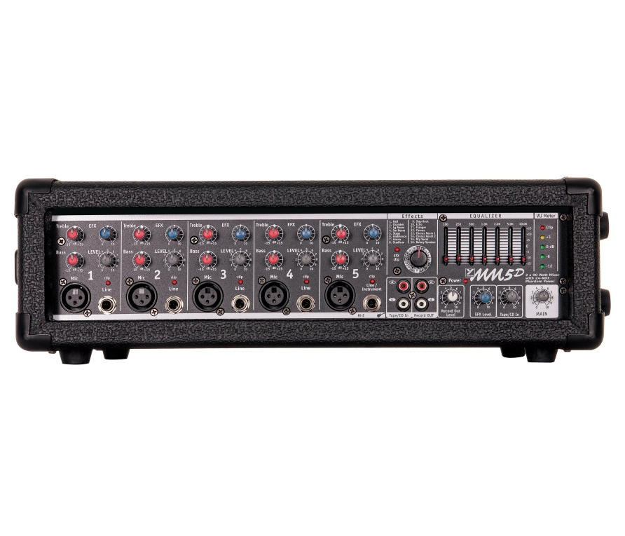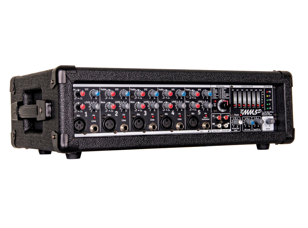 Il y a cinq canaux d'entrée, chacun doté d'une entrée micro XLR, d'une entrée ligne jack 6,35 mm et d'un égaliseur 2 bandes. La section master intègre un processeur DSP 24 bits avec seize effets, dont réverbération, délai et modulation. Un égaliseur graphique 7 bandes permet un réglage précis du mixage.