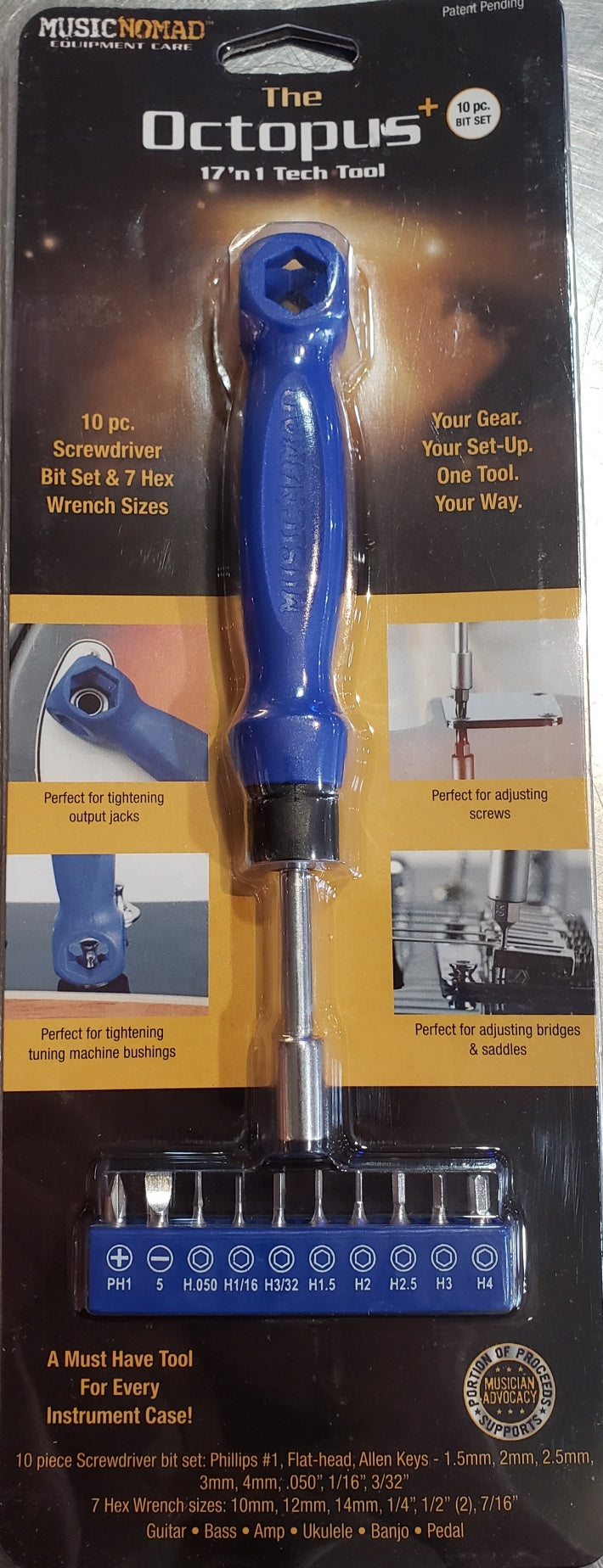 Oubliez de trimballer des tournevis, des tourne-écrous, des clés et des clés Allen ou plusieurs jeux d'embouts dans des étuis encombrants, l'outil technique Octopus 17 'n 1 peut gérer tous les travaux ! Le design innovant en instance de brevet de MusicNomad est l'outil parfait pour serrer ou desserrer les vis et les écrous hexagonaux sur les composants d'engrenage vitaux tels que les ponts, les selles, les écrous de verrouillage, les prises de sortie, les pots de contrôle, les bagues de machine de réglage et plus encore. Dites simplement non au métal... aux outils, bien sûr ! Notre poignée ergonomique est fabriquée à partir d'un matériau en nylon balistique solide qui ne rayera pas ou n'endommagera pas votre matériel et est conçue pour les tailles de clés hexagonales les plus populaires : 10 mm, 12 mm, 14 mm, 1/2" (2) et 7/16". Notre poignée unique contient également l'adaptateur universel, vous offrant encore plus de polyvalence. L'adaptateur universel en métal comprend une 7ème clé hexagonale de 1/4" pour serrer ou desserrer les écrous hexagonaux, De plus, il maintient solidement notre jeu d'embouts de tournevis de 10 pièces. Notre jeu d'embouts de tournevis comprend des embouts Phillips et à tête plate ainsi que 8 embouts de clé Allen (0,050", 1/16", 3/32", 1,5 mm, 2,0 mm, 2,5 mm, 3,0 mm, 4,0 mm) pour presque tous les types. de vis que vous pouvez trouver sur votre équipement. Il s'attaque à tous les travaux, y compris les réglages de précision de pièces comme les systèmes de trémolo. Retirez l'adaptateur universel pour utiliser notre clé hexagonale à profil étroit de 1/2" pour serrer les pots enfoncés et les coupelles télé difficiles à atteindre. Cette un petit outil donne de grands résultats et est indispensable pour chaque étui d'instrument. Il s'attaque à tous les travaux, y compris les réglages précis de pièces comme les systèmes de trémolo. Retirez l'adaptateur universel pour utiliser notre clé hexagonale à profil étroit de 1/2" pour serrer les pots enfoncés et les tasses télé difficiles à atteindre. Ce petit outil donne de grands résultats et est indispensable pour chaque étui d'instrument. Il s'attaque à tous les travaux, y compris les réglages précis de pièces comme les systèmes de trémolo. Retirez l'adaptateur universel pour utiliser notre clé hexagonale à profil étroit de 1/2" pour serrer les pots enfoncés et les tasses télé difficiles à atteindre. Ce petit outil donne de grands résultats et est indispensable pour chaque étui d'instrument.
