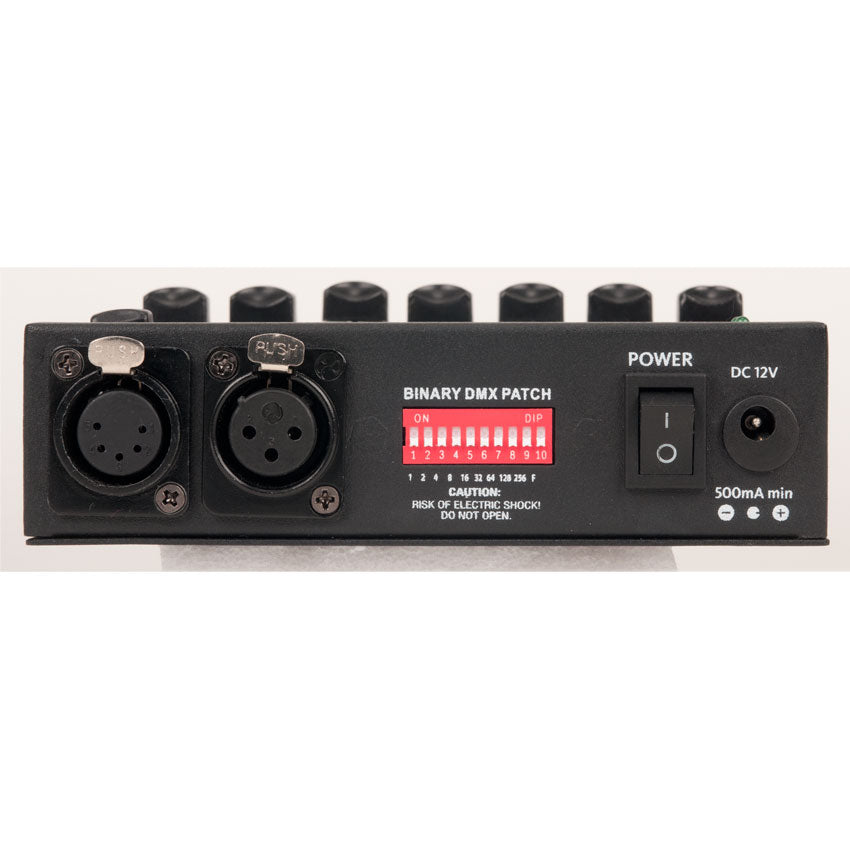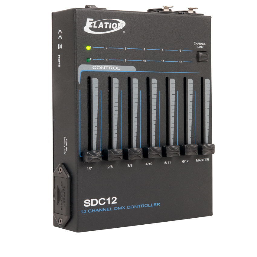 Le nouveau SDC12 comprend 12 canaux DMX, des commutateurs DIP pour définir un canal DMX de départ, un fader de gradateur principal, un interrupteur marche/arrêt, une sortie XLR 3 broches et 5 broches et fonctionne via une alimentation externe 12 V CC (incluse) ou une batterie 9 V CC (non fournie). inclus).