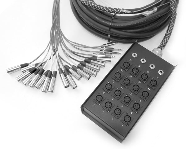 | 100 pieds 599.99$ | 16 canaux micro XLR plus 4 retours XLR - boîtier de scène en métal - serre-câbles en treillis métallique |