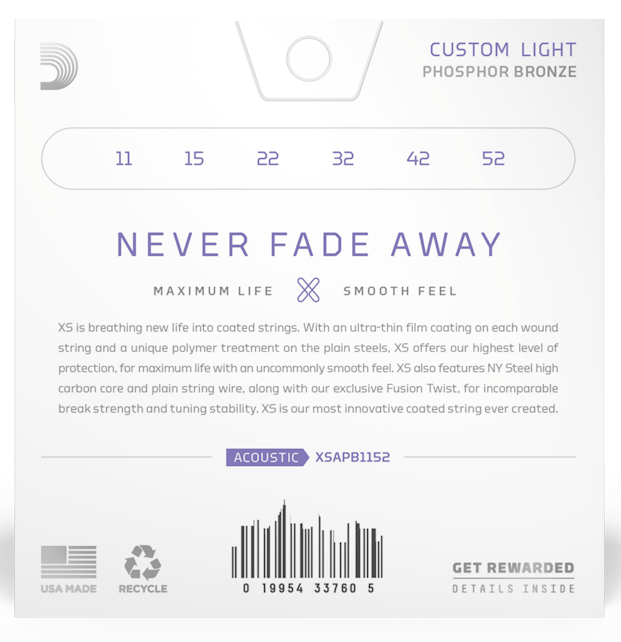 Nées de notre plus grande percée dans l'innovation des cordes, les cordes XS Phosphor Bronze ont la plus longue durée de vie de toutes les cordes de guitare acoustique D'Addario. Le revêtement XS donne à nos cordes audacieuses et brillantes en bronze phosphoreux une durée de vie maximale, avec une sensation de douceur inhabituelle. Fabriquées avec un noyau en acier NY, un fil en bronze phosphoreux et la technologie Fusion Twist, les cordes de guitare acoustique revêtues XS ont une résistance à la rupture et une stabilité d'accord incomparables, en plus de leur durée de vie considérablement augmentée. Cet ensemble de jauges Custom Light 11-52 a légèrement plus de volume et de projection que Extra Light, tout en étant facile à jouer.